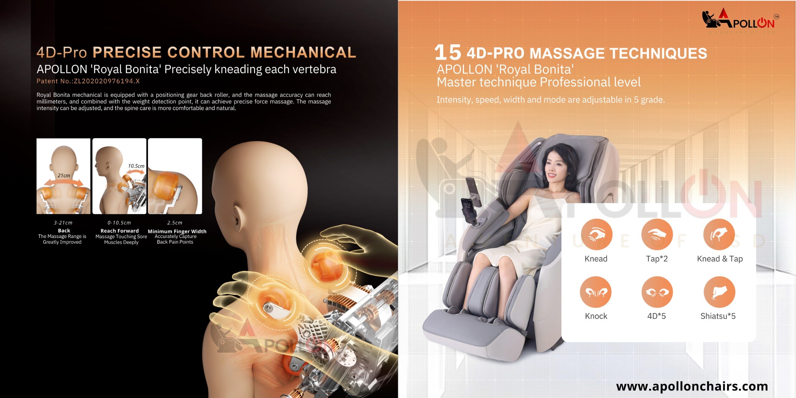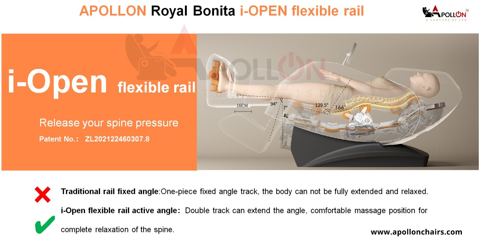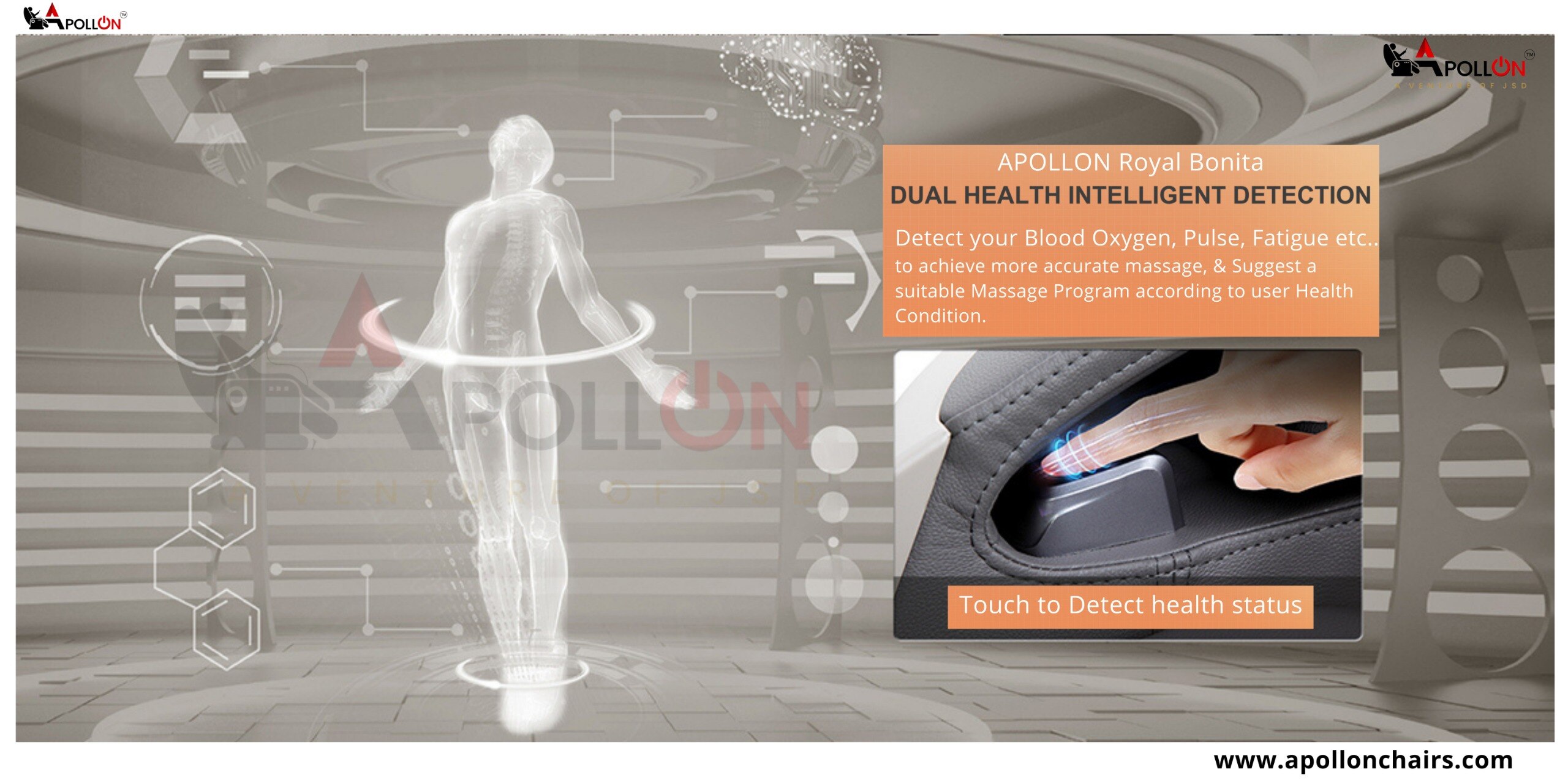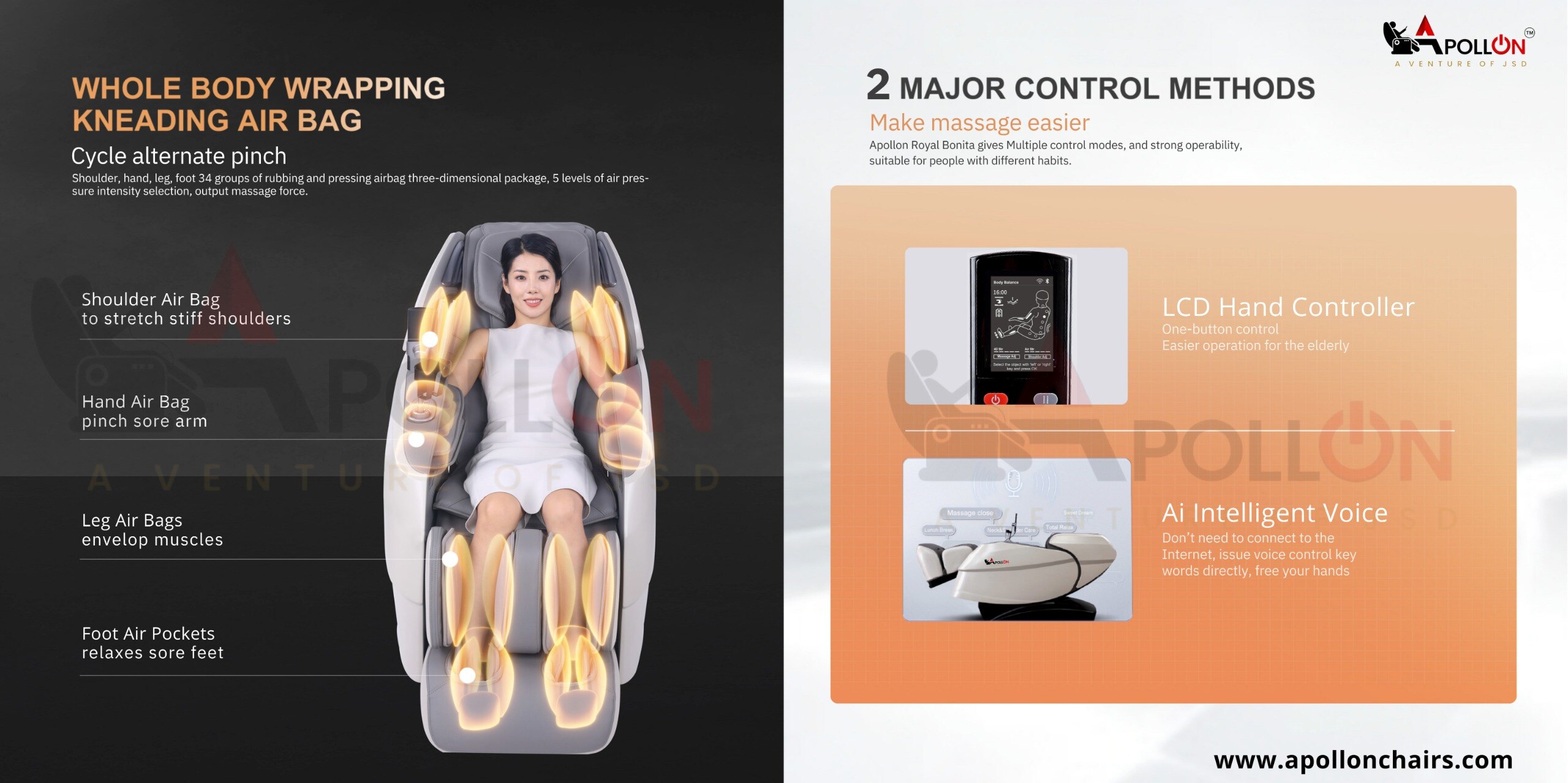 This product is Protected by Transparency, which verifies a unit’s authenticity and enables you to view rich information about the product you purchased. When you receive your product, please look for the Transparency logo and code. You can scan it to verify its authenticity with the Transparency app. To download the Transparency app, get it on the App Store or Google Play. Apollon Royal Bonita is India's 1st Massage chair with iOpen Flexible Rail Technology. APOLLON A550 Auto Match different heights and leg lengths Triple Health Intelligent detection. Graphine Wearable heating shawl. Mastoid magnetic massage on palms Intaligent Voice controll, with voice responce & volume controll, Dualby Bluetooth Speakers. Apollon 'Royal Bonita' Deeply decompress the spine Traction tensile 18+3 Intaligent Auto Programs. with 35,750 different massage combinations AI Suggest a suitable Massage Program according to the user's Health Condition.