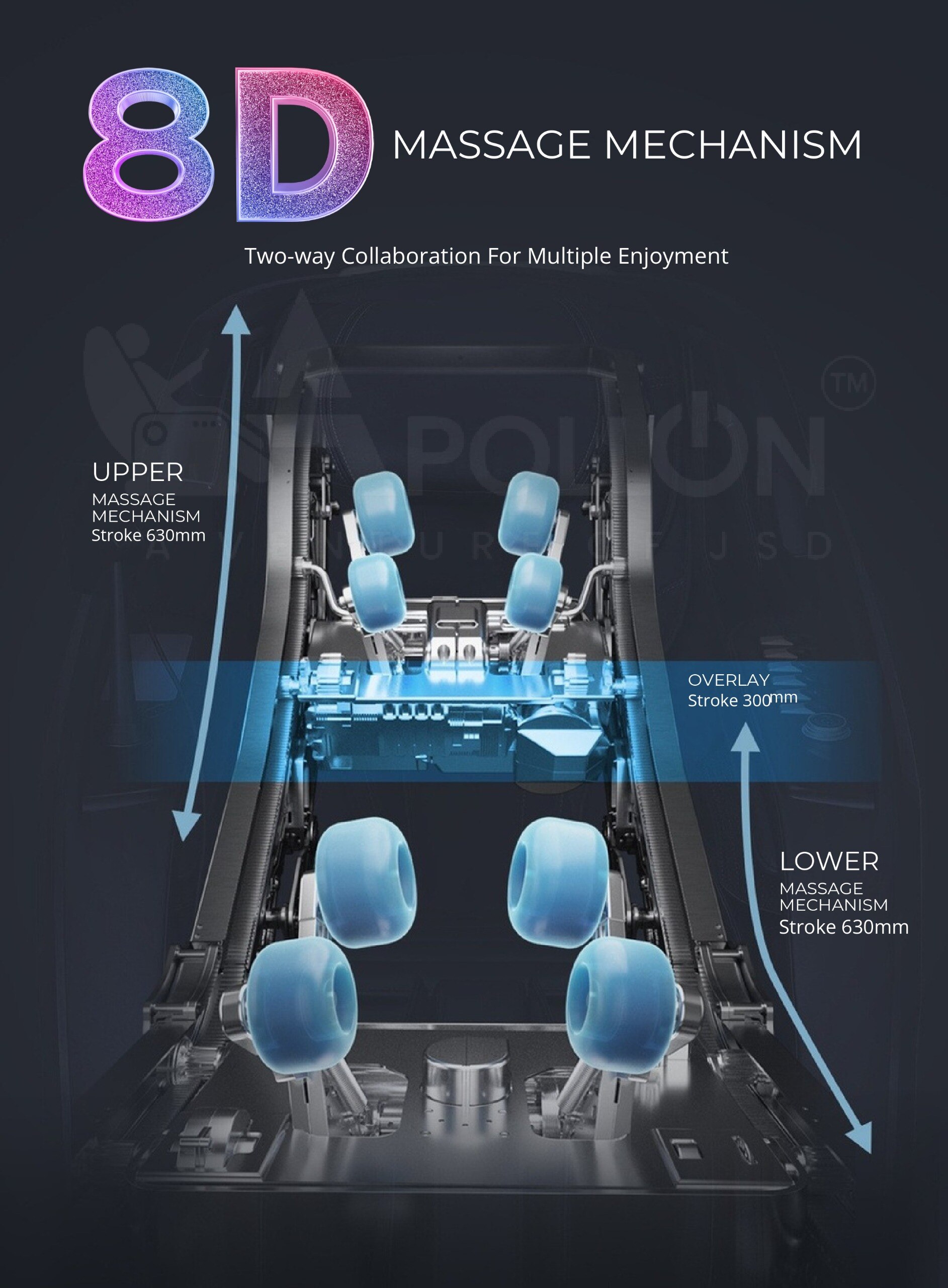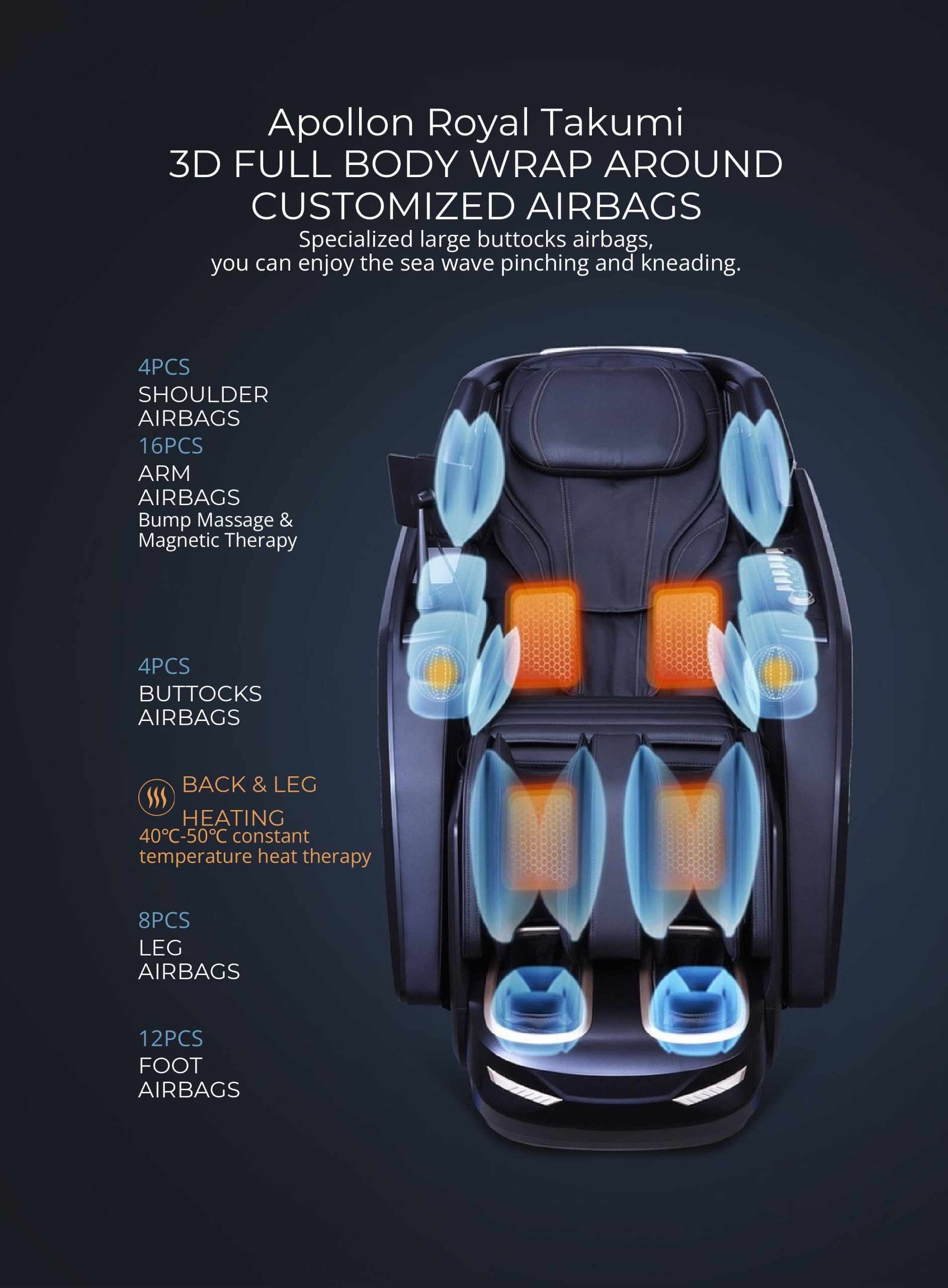 Apollon Royal Takumi India's 1st 8D Dual Core Massage Chair, 4th Generation iOpen Flexible Rail, Health Monitoring, Graphene Heat, Accurate Scanning, Aroma Therapy, Sports car Design & Ambient Lights This product is protected by Transparency, which verifies a unit’s authenticity and enables you to view rich information about the product you purchased. When you receive your product, please look for the Transparency logo and code. You can scan it to verify its authenticity with the Transparency app. To download the Transparency app, get it on the App Store or Google Play. FLEXIBLE GUIDE TAIL FOR DEEP SPINAL PRESSURE RELIEF: Features 4th Generation 166° iOpen Flexible Rail technology that adapts to spine curvature, providing superior coverage and comfort during massage sessions During the lying down massage, It can effectively increase the width of the guide rail and better fit the curve of the human spine. Combined with the movement, the massage is fully covered from the shoulders and neck to the thighs. Comprehensively enhance the comfort of massage. APOLLON'S LATEST DUAL ENGINE TECHNOLOGY: Equipped with Dual 4D Pro smart massage hands. The touch is more flexible, the fit is more sensitive, and the movement is more flexible, providing strong massage power. It penetrates deep into the fascia, allowing the body to truly enjoy the art of massage with precise intelligent coordination and control. The area of impact is increased by 60% due to the double massage mechanism. HOT STONE Massage and Care for the Intestine: Heating up the back and waist, keeping warm, and dispelling the cold. Hot compress on both sides of the legs to relieve soreness and bloating. Increased heating area of the waist, combined with waist and back kneading and massage. Accelerate blood circulation in the lower back and effectively alleviate lower back pain. Three minutes of constant temperature hyperthermia reaching 40 ℃ -50 ℃. Paired with the hot compress function in autumn and winter, It has good health benefits for women, the elderly, and people with physical disabilities. Graphene heating system maintains a constant temperature for effective back and leg muscle relaxation INTELLIGENT FEATURES: Equipped with AI health monitoring system that provides accurate body scanning with Triple health Intelligent Detection. Detect your Blood Oxygen, Pulse, Fatigue level, Microcirculation etc.. to achieve a more accurate massage. Comes with Apollon's special Stereo sound system for a personalised and immersive massage experience New armrest shortcut buttons with warm and soft ambient light design, providing you with guidance in the dark. Shoulder, arm airbags, sitting side airbags, leg massage airbags, and foot airbags to relieve tension on the body. The airbags alternate squeezing, allowing for a wave-like grip LUXURY DESIGN: Sports car-inspired aesthetics with ambient lighting and aromatic therapy features, complemented by triple operating modes for versatile massage options. ZERO GRAVITY FLOATING EXPERIENCE: Place the thighs and calves horizontally above the heart, The gravity of body parts will be evenly distributed throughout the massage chair. To achieve a zero-gravity state. The center of gravity of the human body is on the buttocks, reducing pressure on the spine and joints. Realize complete relaxation of the body.